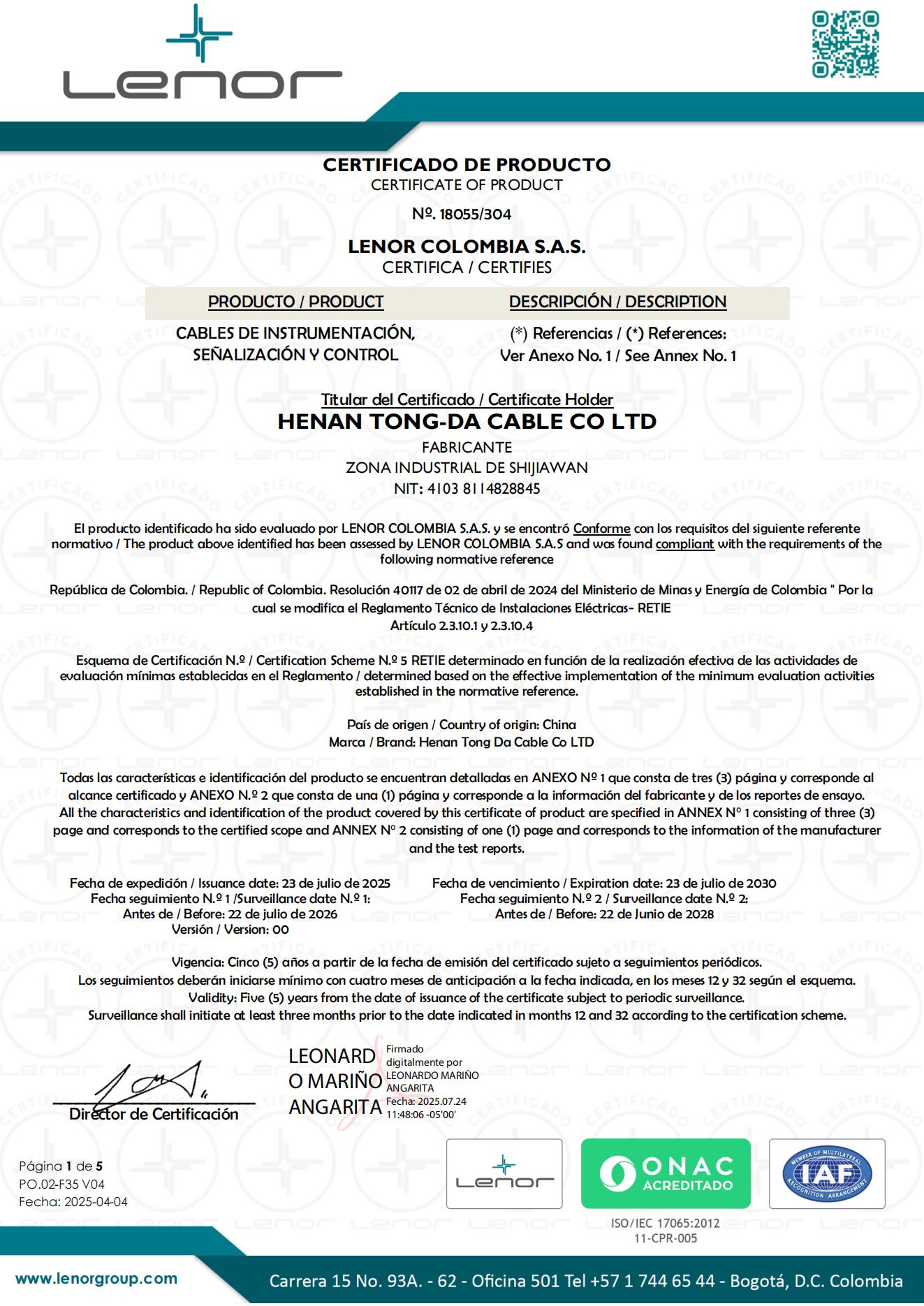 18055 CERTIFICADO Control cable -