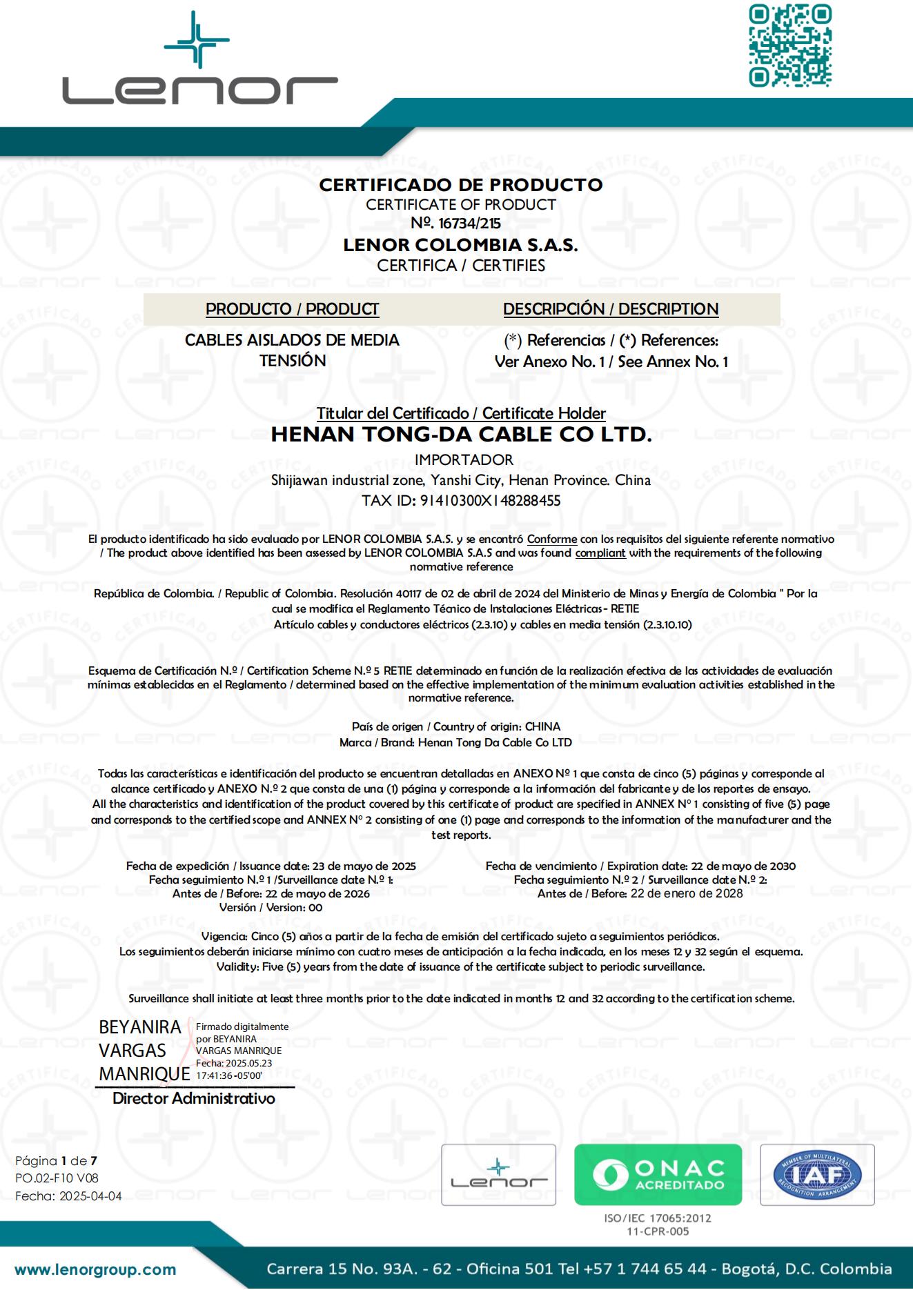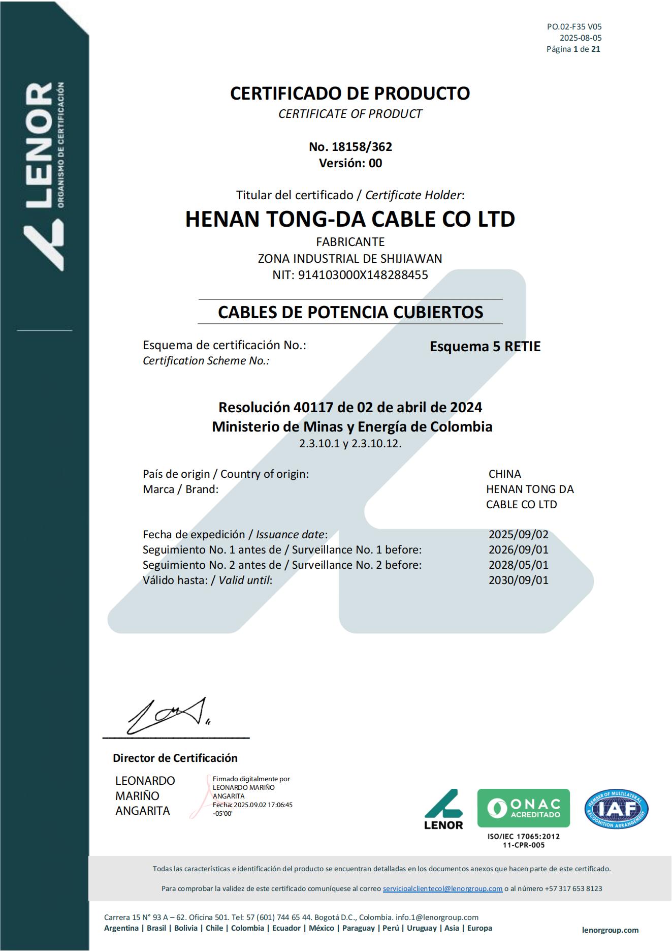 16734 CERTIFICADO MV POWER CABLE -
